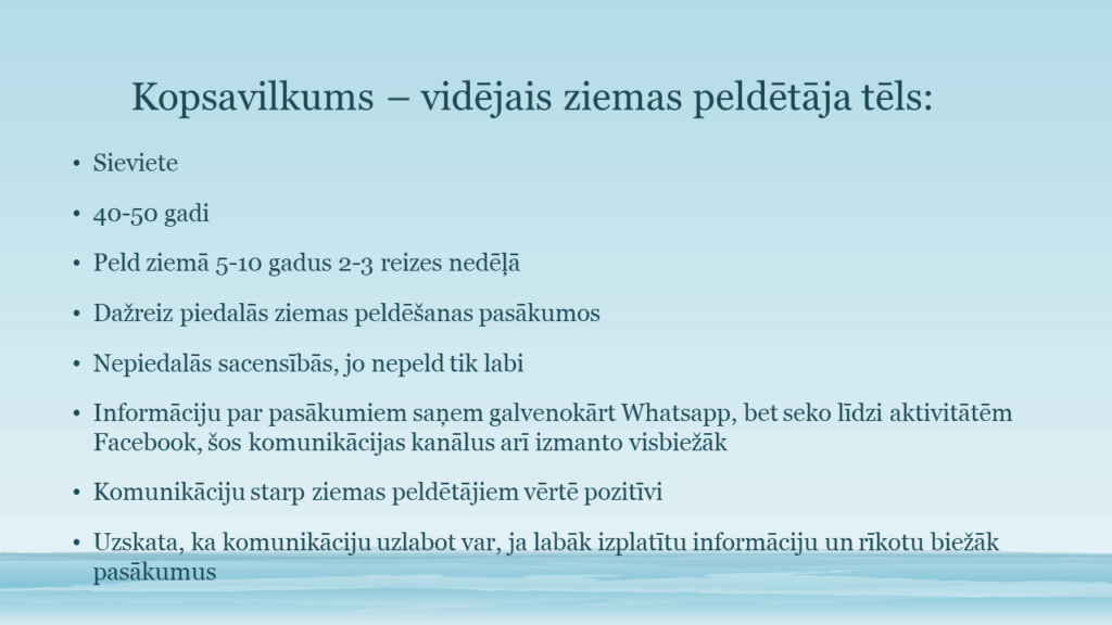 …vidējais Latvijas ziemas peldētājs ir 45 gadus veca sieviete, kura aktīvi piedalās peldēšanas pasākumos, taču izvairās no sacensībām, jo nepeld tik labi?